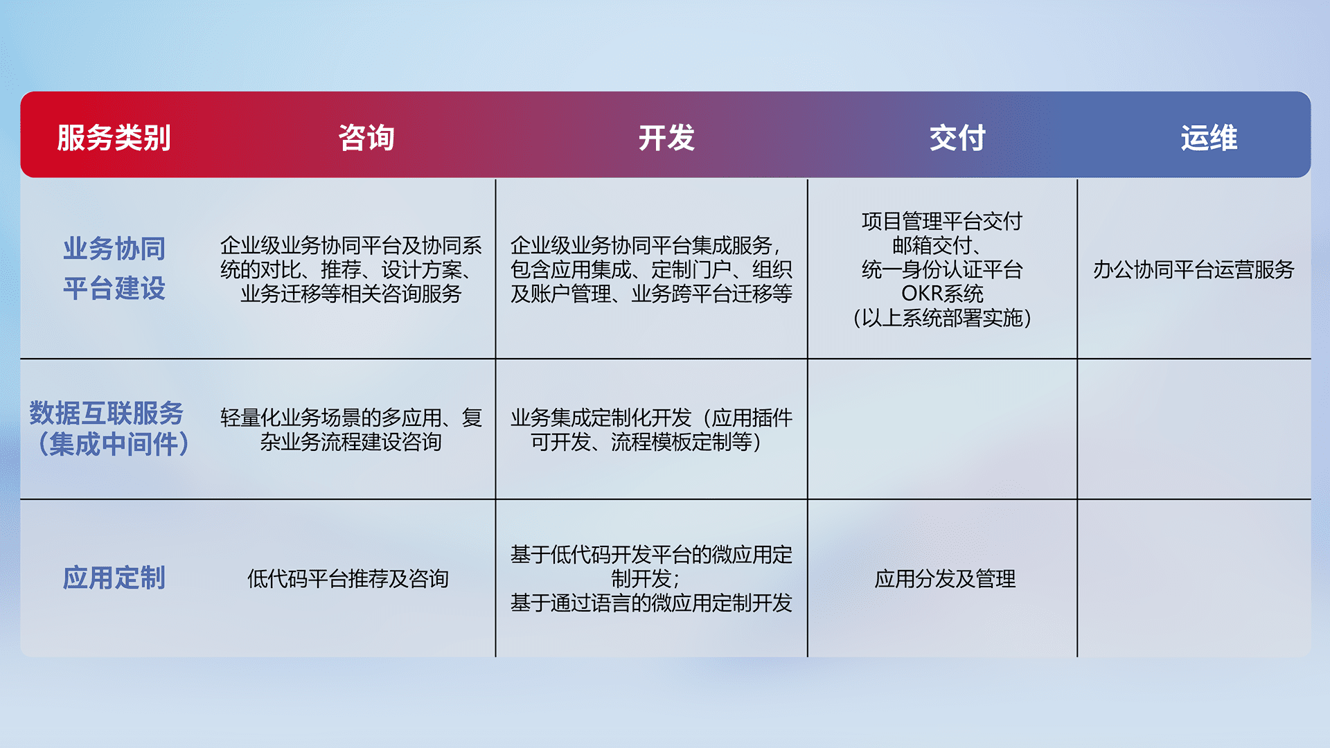 针对钉钉、、、、企微、、IDaas等平台级产品提供产品的规划、、、、方案、、交付、、、、定制化开发等服务,,,实现如统一协同办公、、智能客户服务、、、、混合会议管理、、、、智能数据查询、、、、等业务场景,,,,实现数字化转型。。。