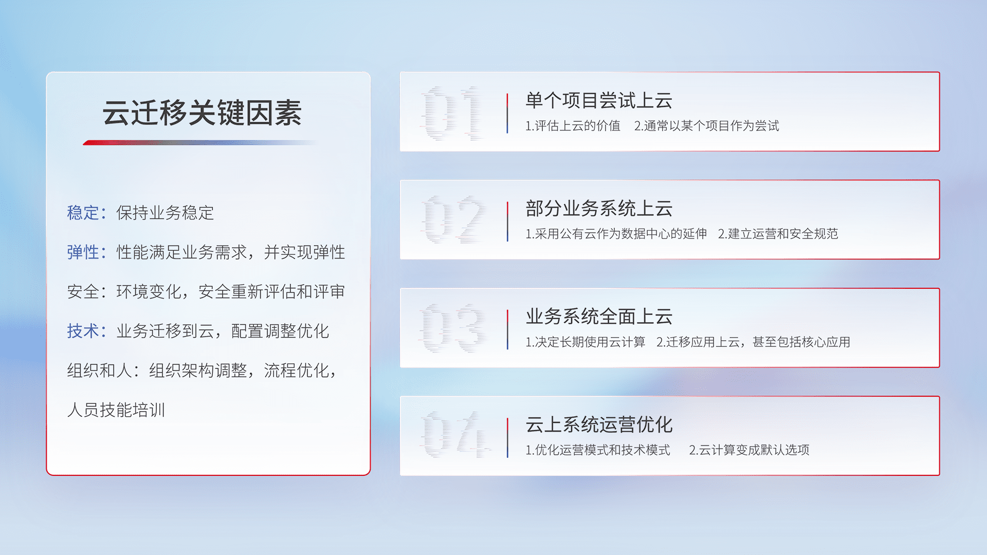 结合实际业务,,,从规划设计、、、、云平台选型、、云原生改造、、数据迁移、、、集成交付,,迁移全过程为客户识别最佳上云路径,,,做好风险识别管理,,,设计网络架构、、、身份权限、、、安全审计合规、、、操作审计、、、日志审计、、、监控告警策略、、、、多站点容灾设计等,,,对云上基础设施进行整体规划,,,,提升IT治理水平,,,以满足弹性、、、高可用、、、、高性能的需求。。