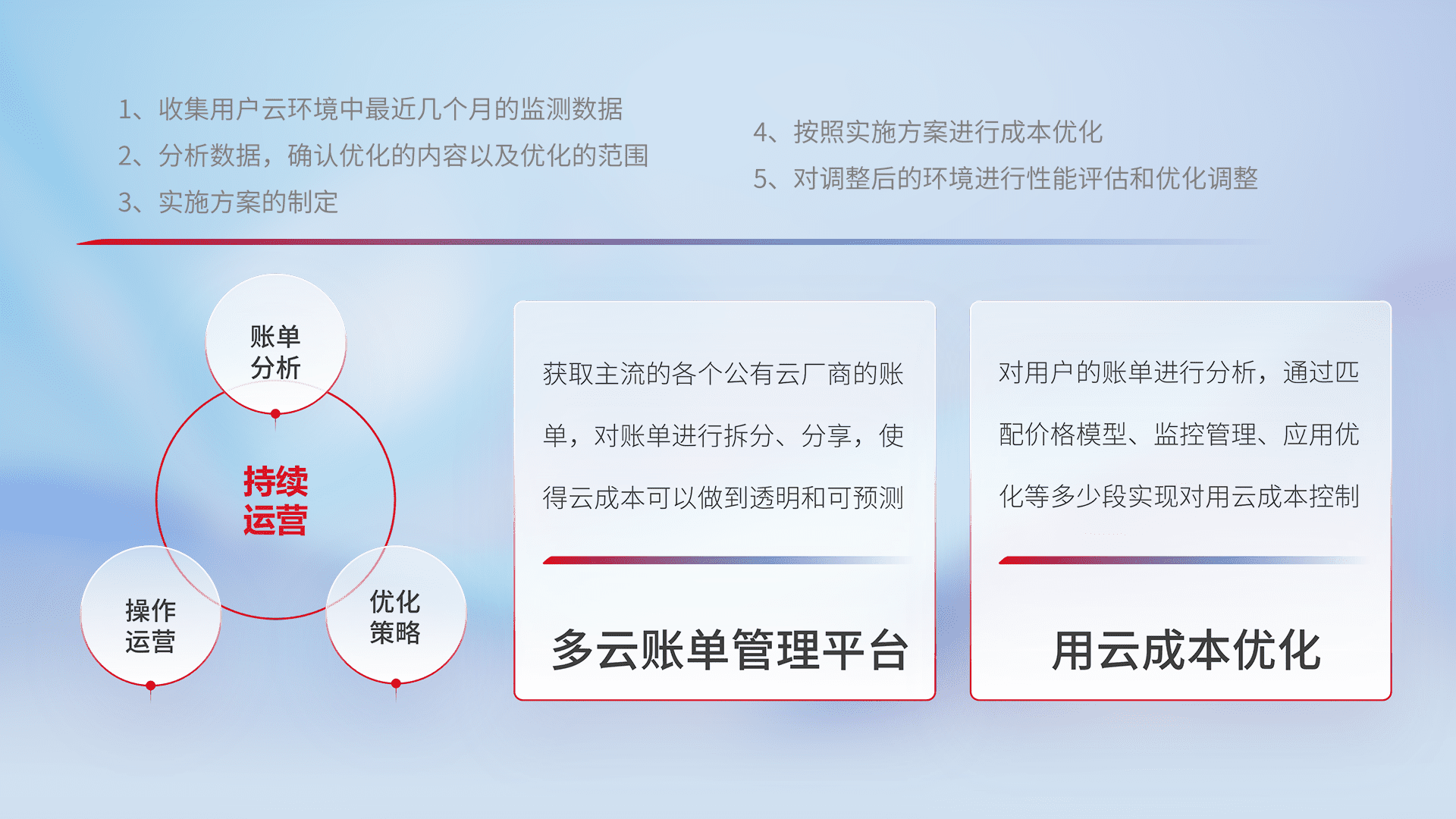 通过多云纳管,,,,以统一的资源数据模型把客户的云资源进行抽象和封装,,,,进而实现对多云资源的统一操作,,,保障云资源管理的可靠性、、、、稳定性与可用性。。。量身定制化运维内容,,配置、、、开发运维、、、补丁管理、、备份、、、监控、、认证和访问管理、、、审计和日常巡检等,,,,保障在用云过程中的可靠度,,,,稳定度以及高可用率。。。。